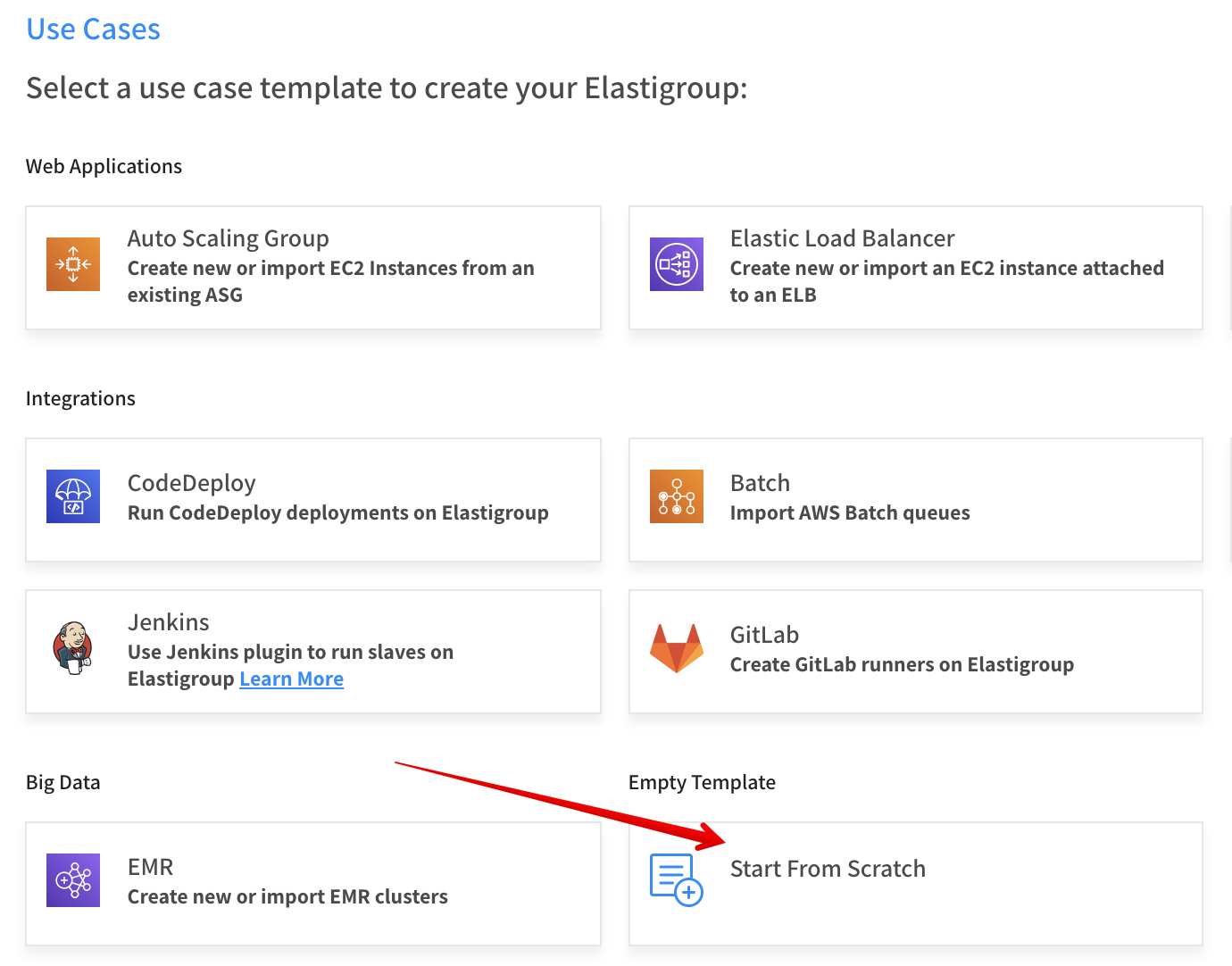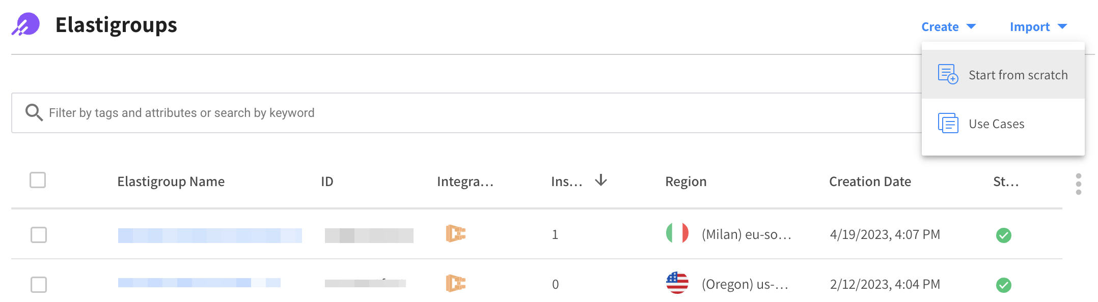 ElastigroupAWSGetting StartedCreate an Elastigroup for AWSOn this pageCreate an Elastigroup for AWS If you have already connected your AWS account, you can start creating Elastigroups. Create an Elastigroup from Scratch