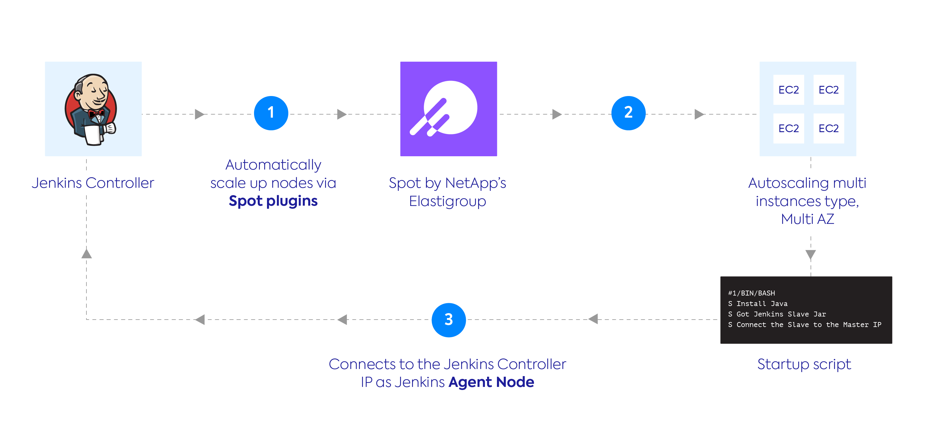 The Spot Jenkins plugin enables you to run a lower powered Jenkins server (controller) and spin up Jenkins agents as needed while saving up to 90% on compute costs. Agent-instances are scaled in an Elastigroup to match the demand for jobs to be completed. Spot's Jenkins plugin supports AWS Spot instances, GCP preemptible instances, and Azure Spot VMs.