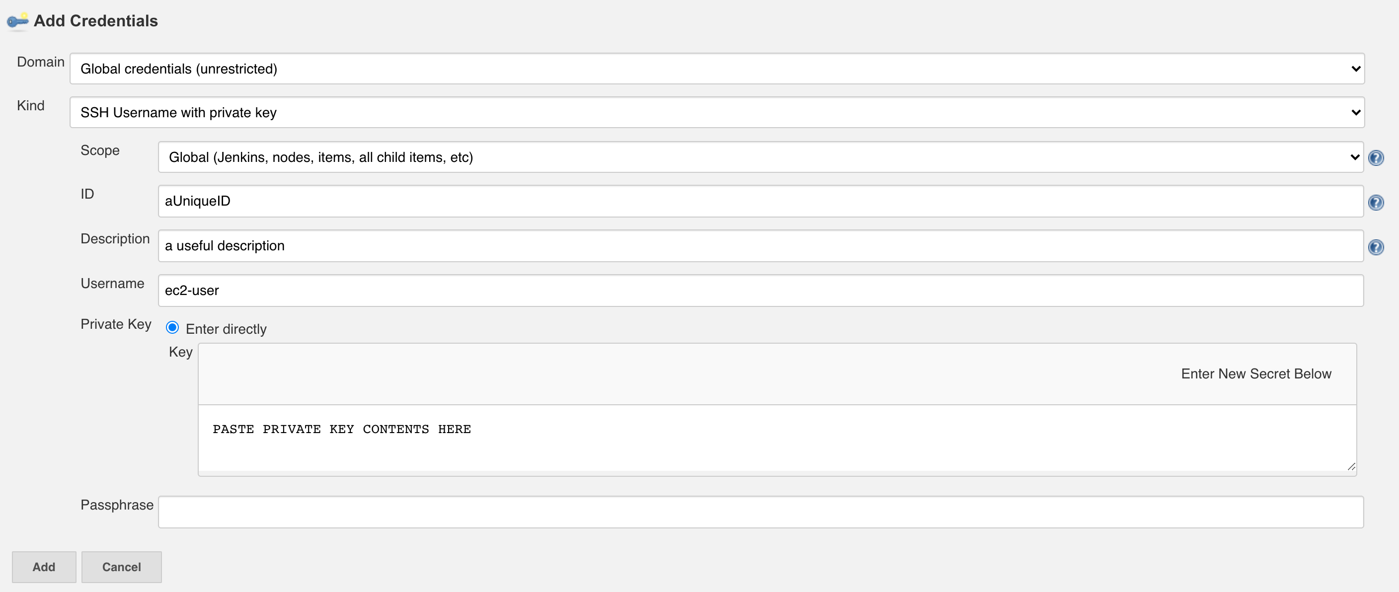 You can keep the passphrase blank as your agents will be launched programmatically, or you can choose to utilize a passphrase and have Jenkins fill it for you (see credentials section below).